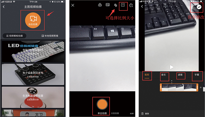 6. 拍摄完成之后点击右上角的 √ 就可以保存视频并且进行上传关联对应宝贝。(1:1的可以直接上传关联宝贝,3:4的需要到电脑端淘拍编辑过才可以进行宝贝关联)